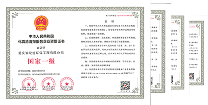 本公司擁有四個(gè)國(guó)家一級(jí)資質(zhì):化糞池清掏服務(wù)企業(yè)國(guó)家一級(jí)資質(zhì)、市政環(huán)境清潔維護(hù)服務(wù)企業(yè)國(guó)家一級(jí)資質(zhì)、管道疏通服務(wù)企業(yè)國(guó)家一級(jí)資質(zhì)、河道垃圾處理企業(yè)國(guó)家一級(jí)資質(zhì)。